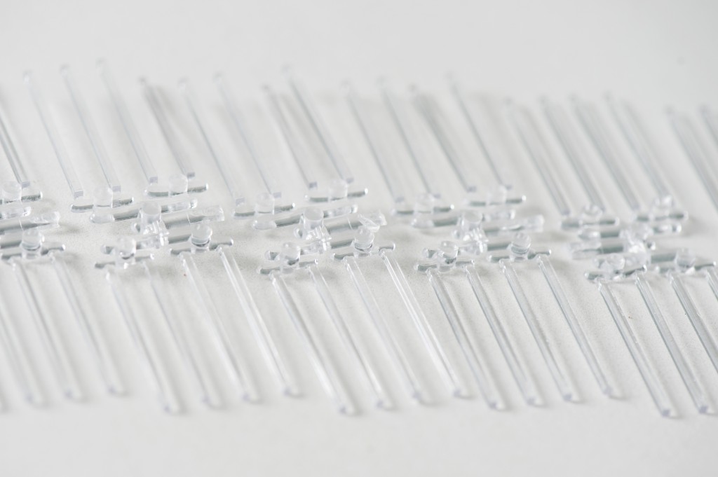 Injection-molded clear plastic rods, 1.59mm x 1.59mm x 32mm. These "Type-I" rods have a small nub that can be used as a reference point to determine the collection side of the sampling rod. Rods are available ungreased in packages of 100, or pre-greased in larger quantities.