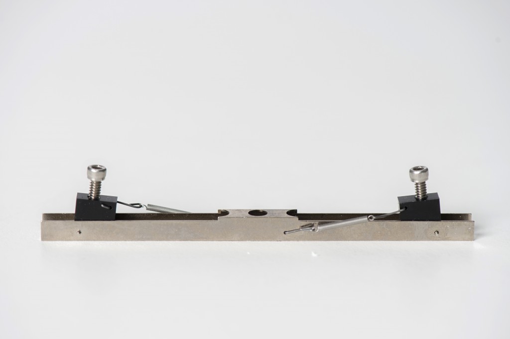 Microscope slide used for mounting sampling rods for analysis, sometimes referred to as a microscope stage adaptor. This clear plastic slide is machined with two polished grooves so that up to two "Type-I" rods (1.59mm width) can be analyzed at a time.